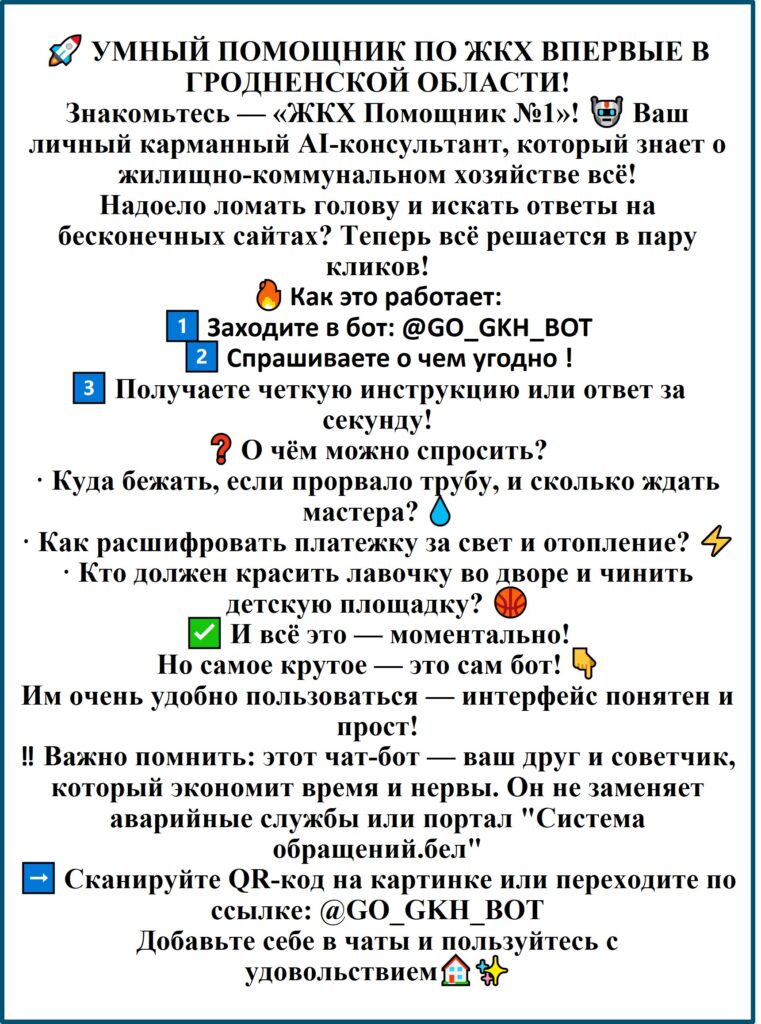 Государственное объединение «Жилищно-коммунальное хозяйство Гродненской области» сообщает, что с целью повышения качества информирования населения Гродненской области по вопросам жилищно-коммунального хозяйства и оптимизации процесса рассмотрения обращений граждан запущен специализированный цифровой сервис — чат-бот «ЖКХ Помощник №1».