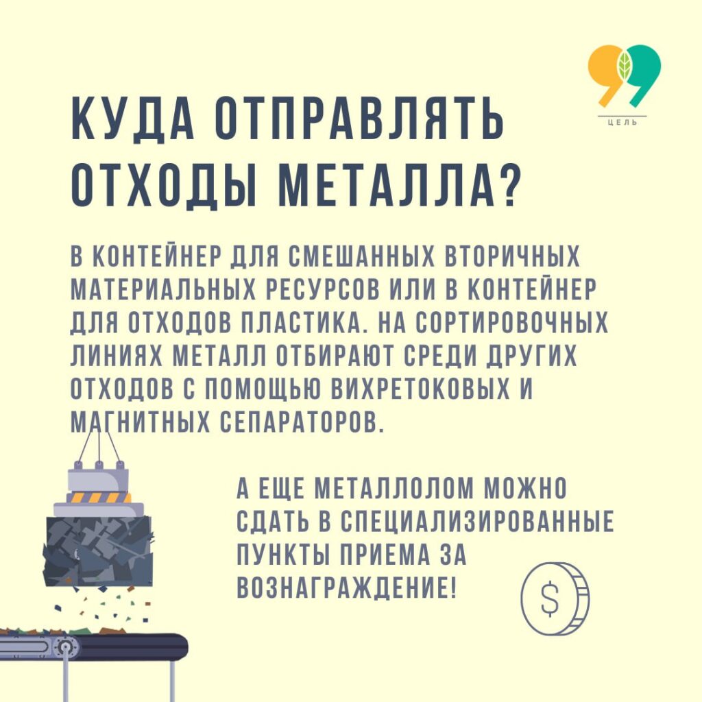 в контейнер для смешанных вторичных материальных ресурсов или в контейнер для отходов пластика. 🧲 На сортировочных линиях металл отбирают с помощью сепараторов.
